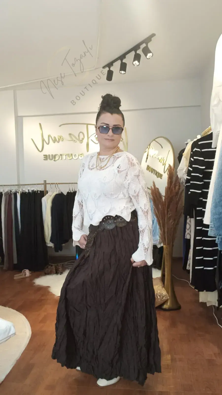 Neşe Tozanlı Boutique ile konforu ve stili aynı anda yaşayın. Bu Acı Kahve Kırışık Dokulu Etek, gardırobunuzun en pratik ve en havalı parçası olmaya aday.