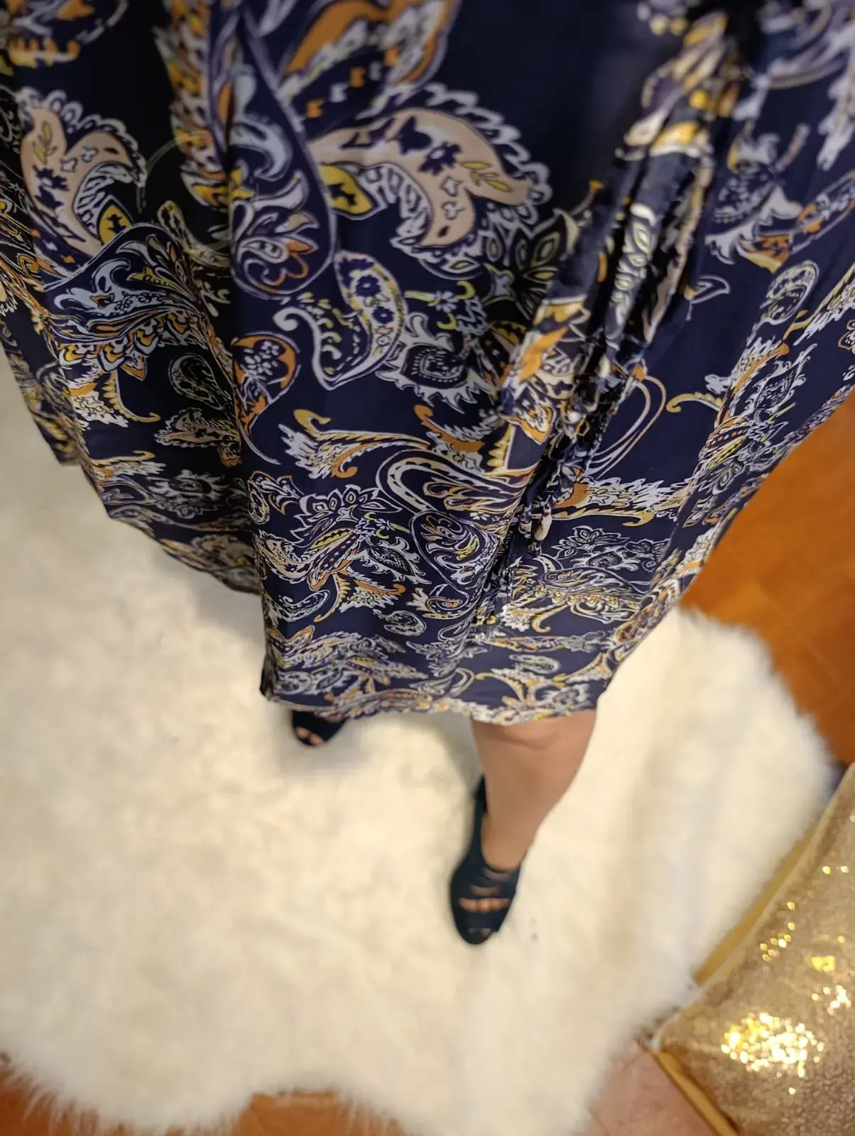 Desen: Lacivert/Siyah zemin üzerine Gold/Bej Şal (Paisley) desenleri.
