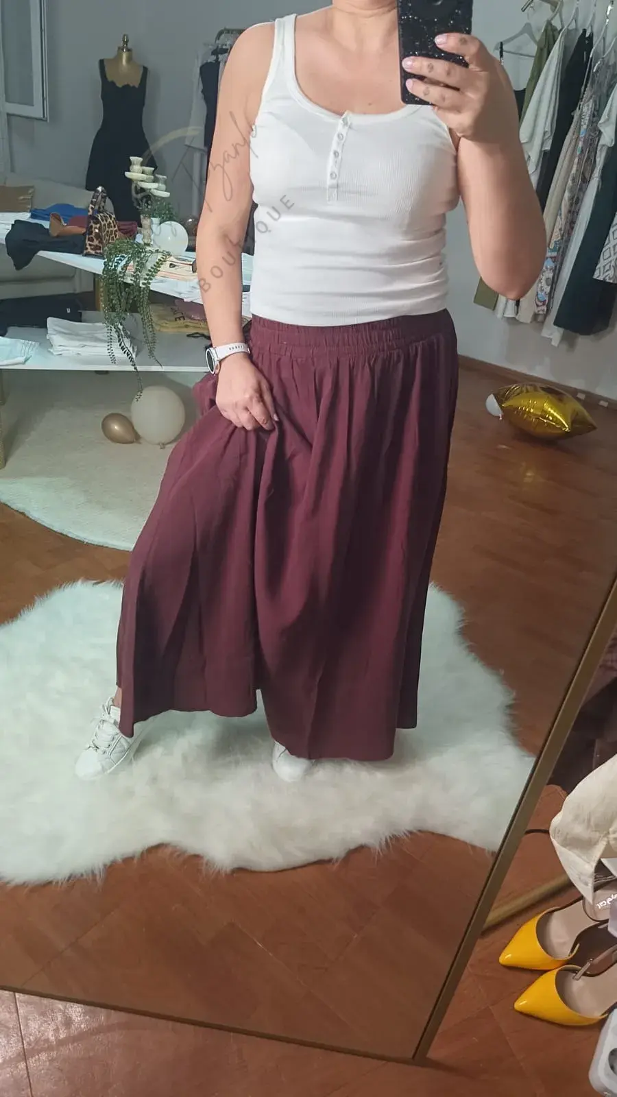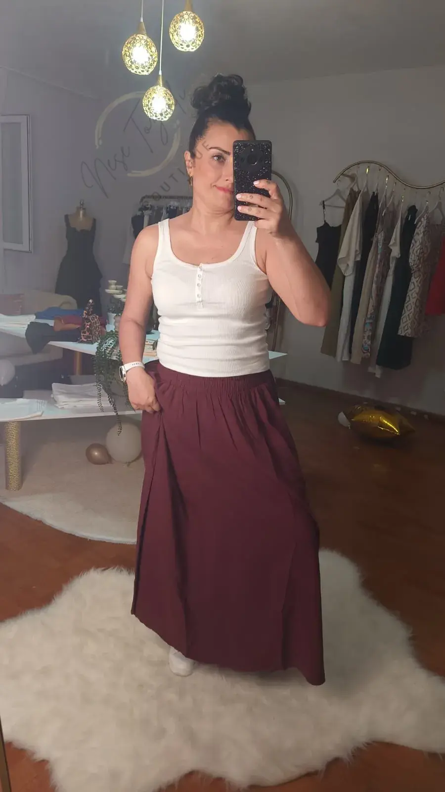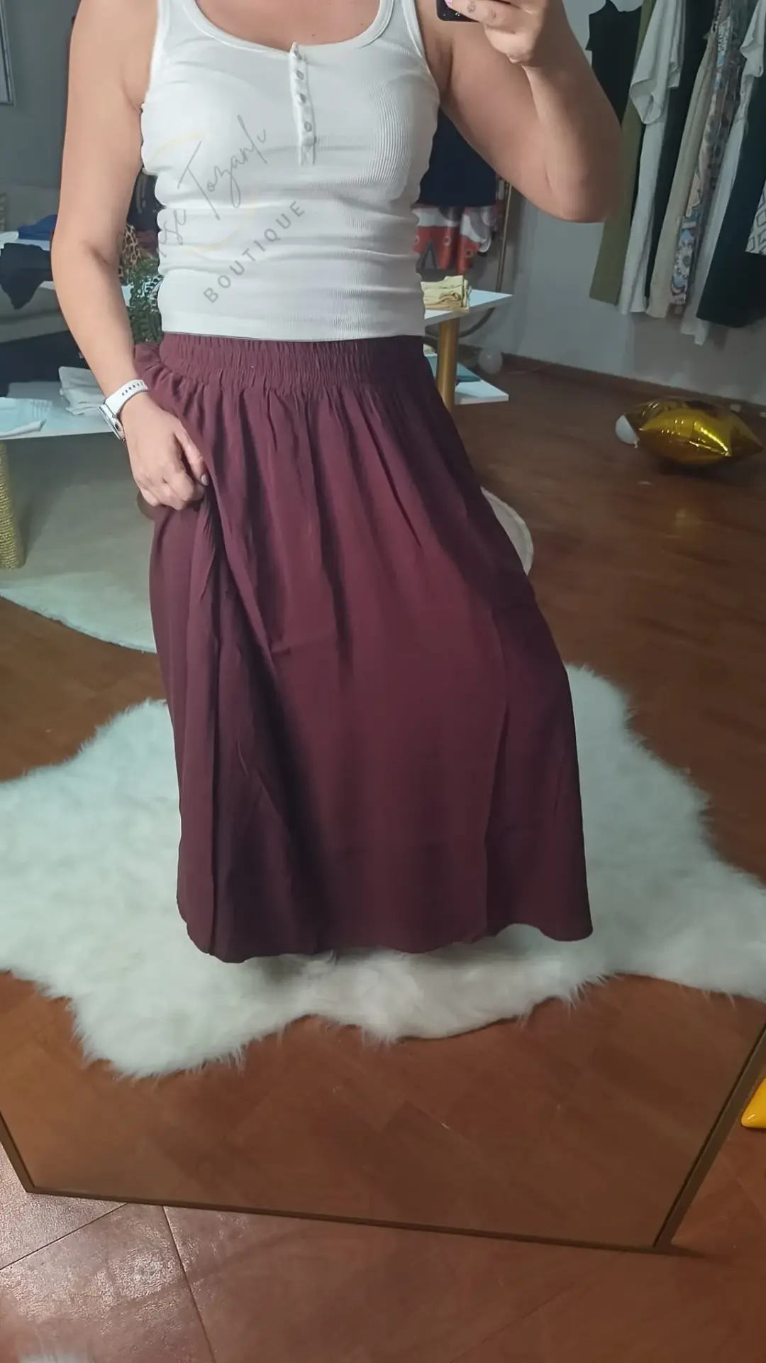 Neşe Tozanlı Boutique koleksiyonunun en "rahat" üyesiyle tanışın. Bu Bordo Maxi Etek, hareket özgürlüğüne düşkün kadınlar için özel olarak tasarlandı.