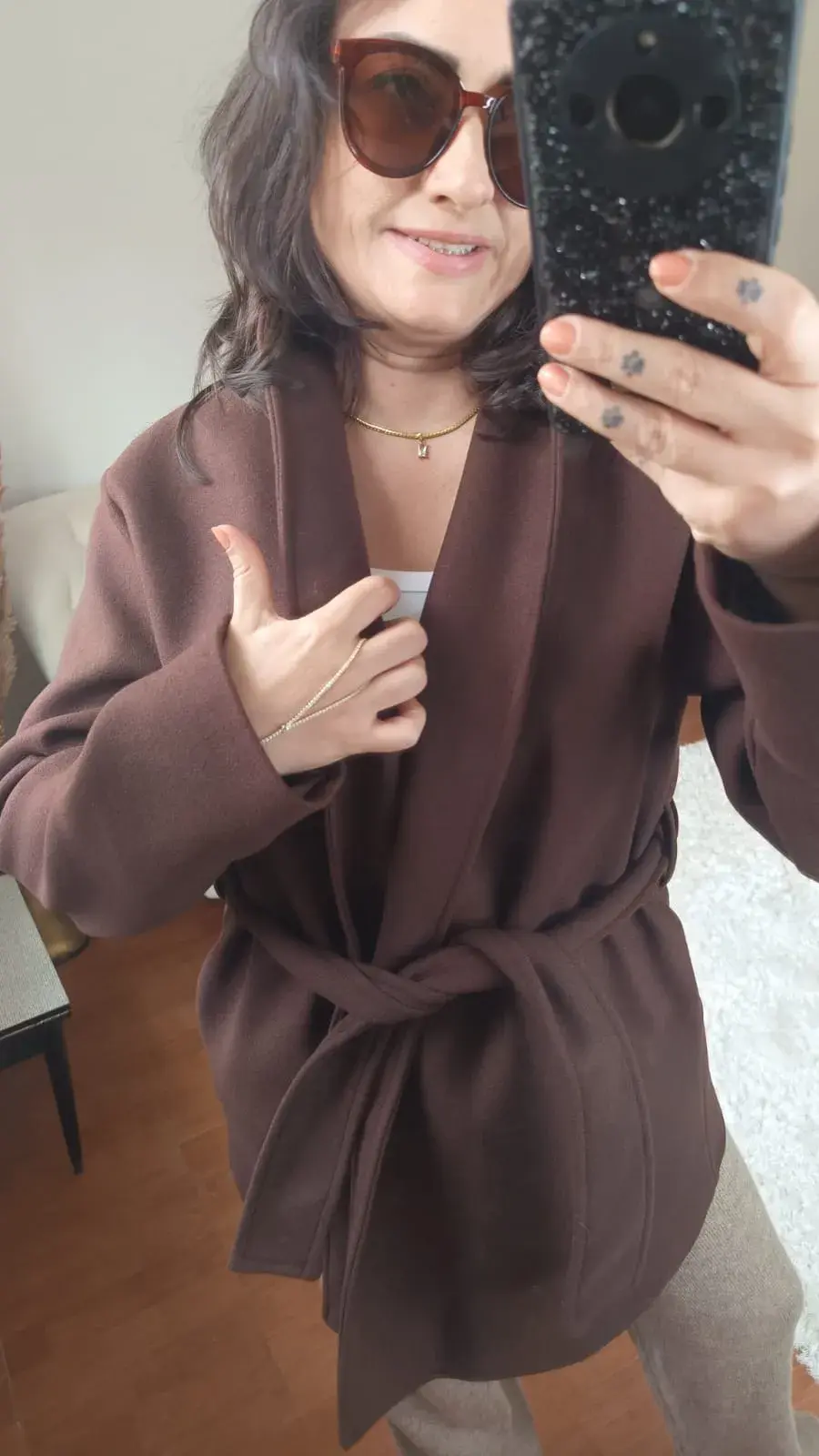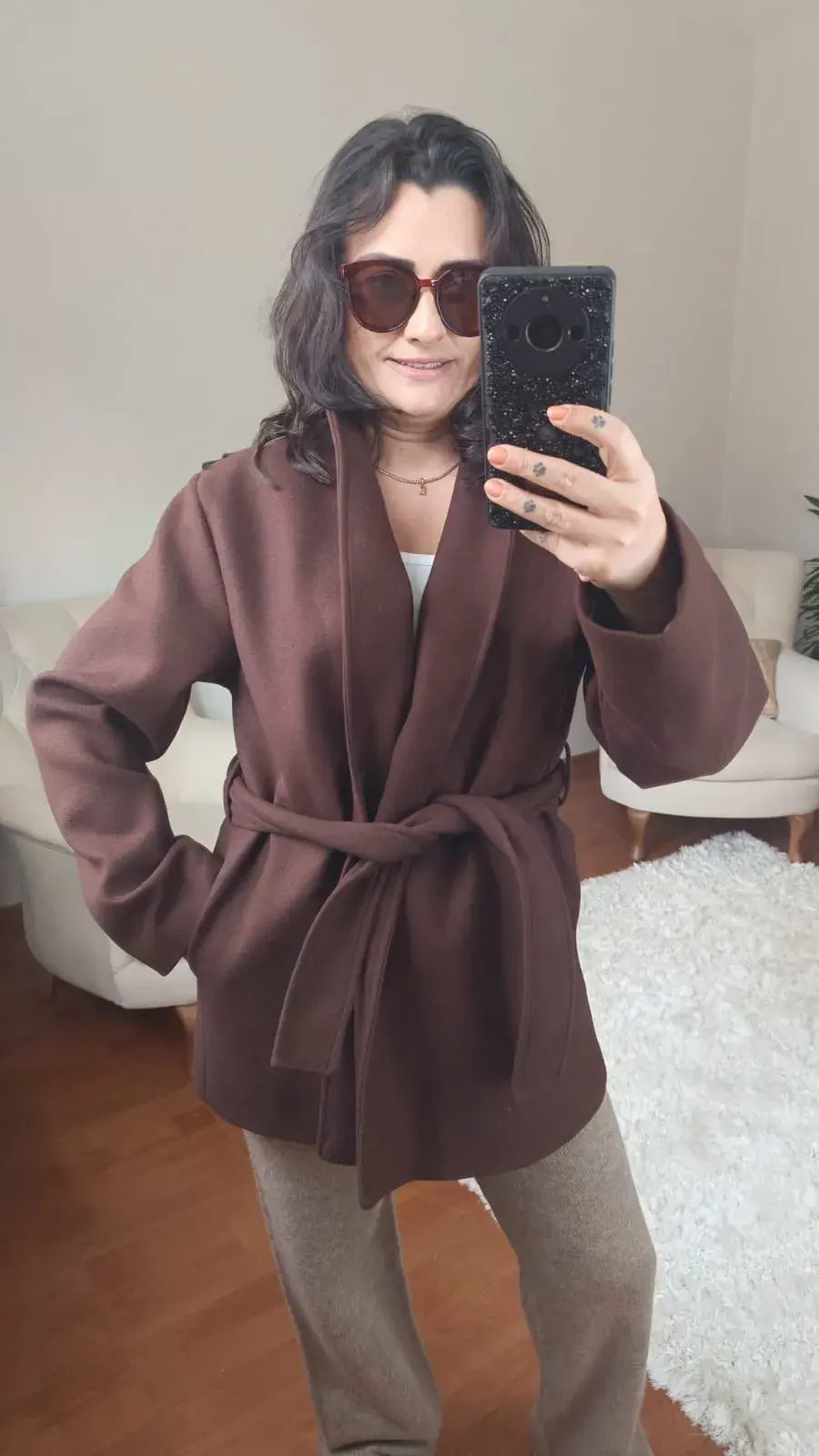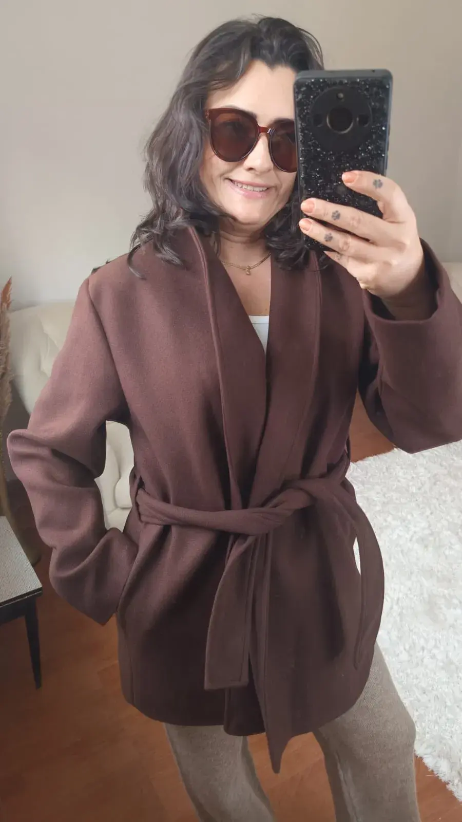 Sizi sezonun soğuğundan koruyacak yüksek kaliteli kaşe kumaşı, lüks ve yumuşak dokusuyla zarafetinizi tamamlar. Tasarımın odak noktası olan belden bağlamalı kuşağı, siluetinizi anında tanımlar, feminen bir duruş sergiler ve şıklığınızı zahmetsizce bir üst seviyeye taşır.