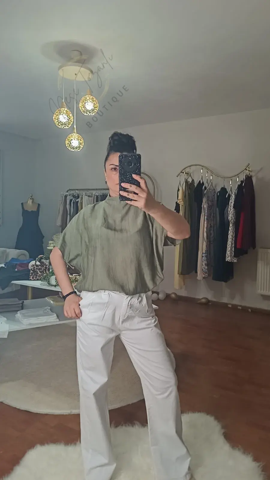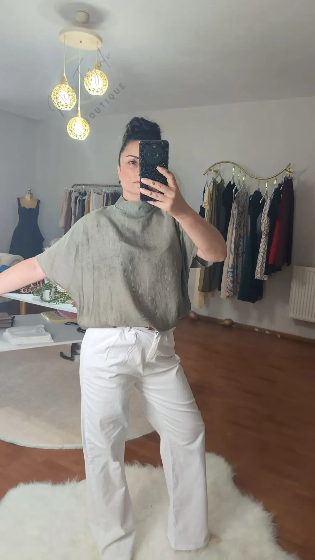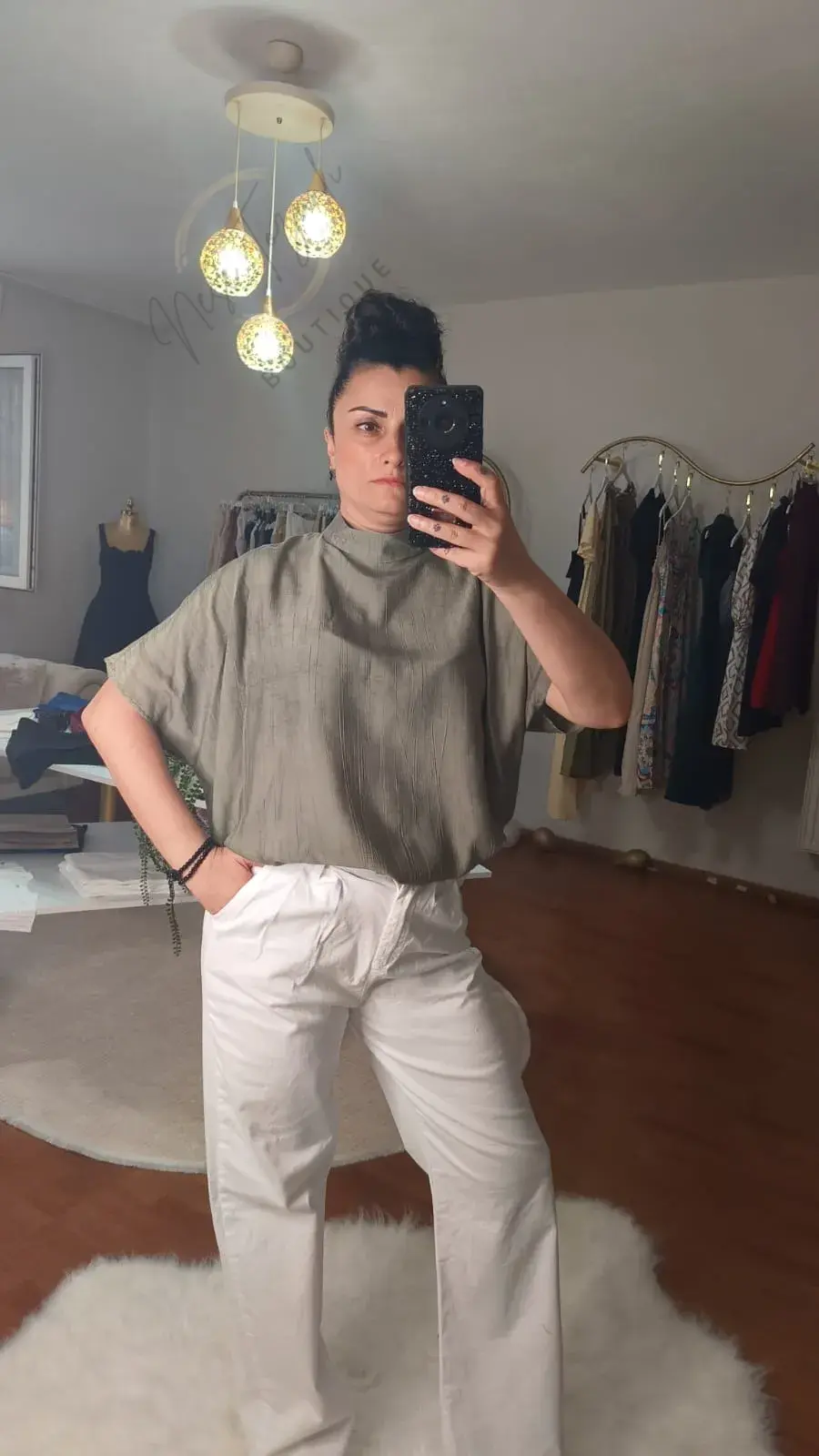 Kumaşının kendinden dikey çizgili/kırışık dokusu, ona doğal ve modern bir hava katar. En güzel yanı ise ütü gerektirmeyen yapısıdır; tatil valizinizden çıkarıp direkt giyebilirsiniz. Yarasa kol kesimi ve dökümlü formu vücut hatlarını gizlerken, yarım dik yaka tasarımı boynunuzda zarif bir duruş sergiler.