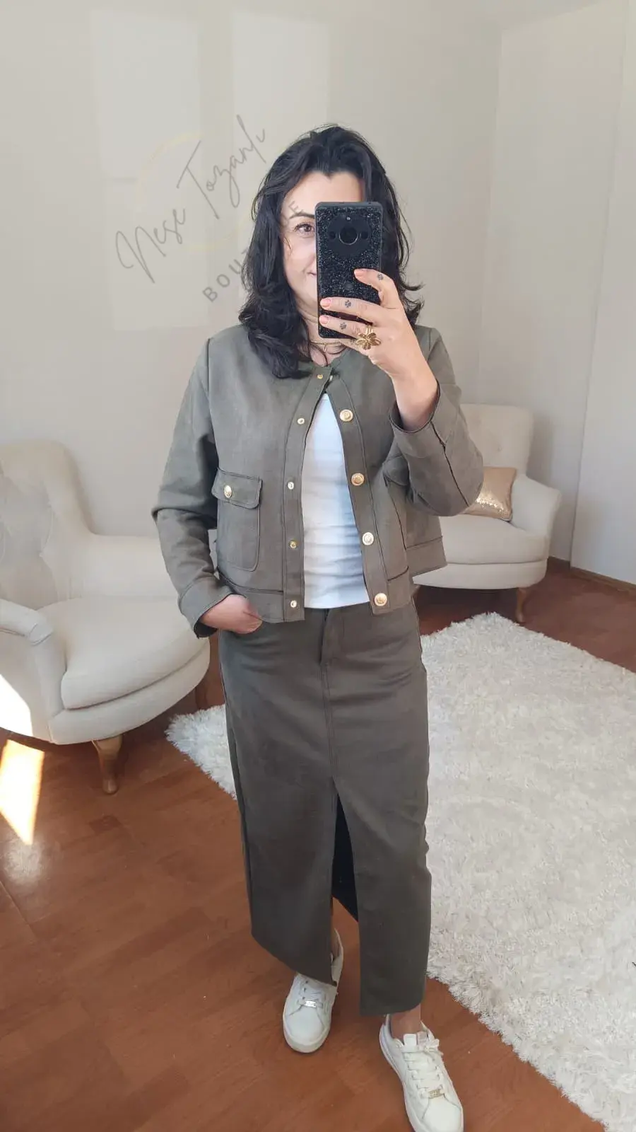 Tasarımın yıldızı olan parlak gold (altın) düğme detayları, hem modern kesim cekete hem de zarif etek parçasına lüks bir ışıltı katar. İster birlikte giyerek sofistike bir bütünlük yaratın, ister ceketi ve eteği ayrı ayrı kombinleyerek gardırobunuza iki yeni joker parça ekleyin. Bu takım, duruşunuz ve zarafetiniz olacak.