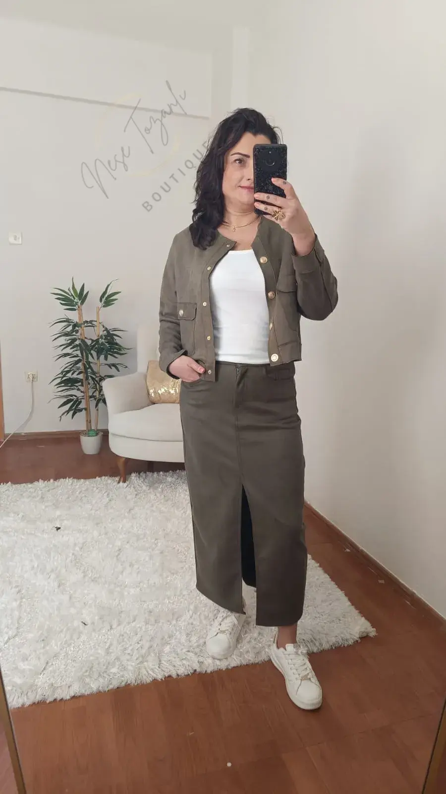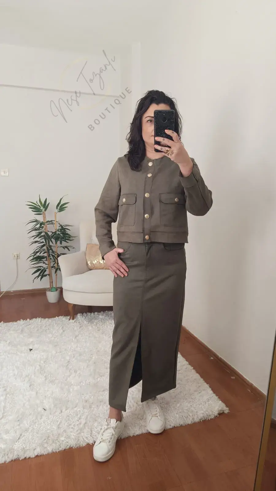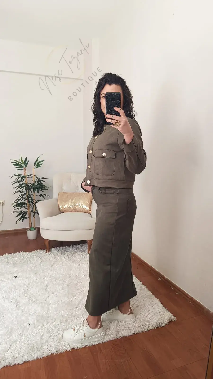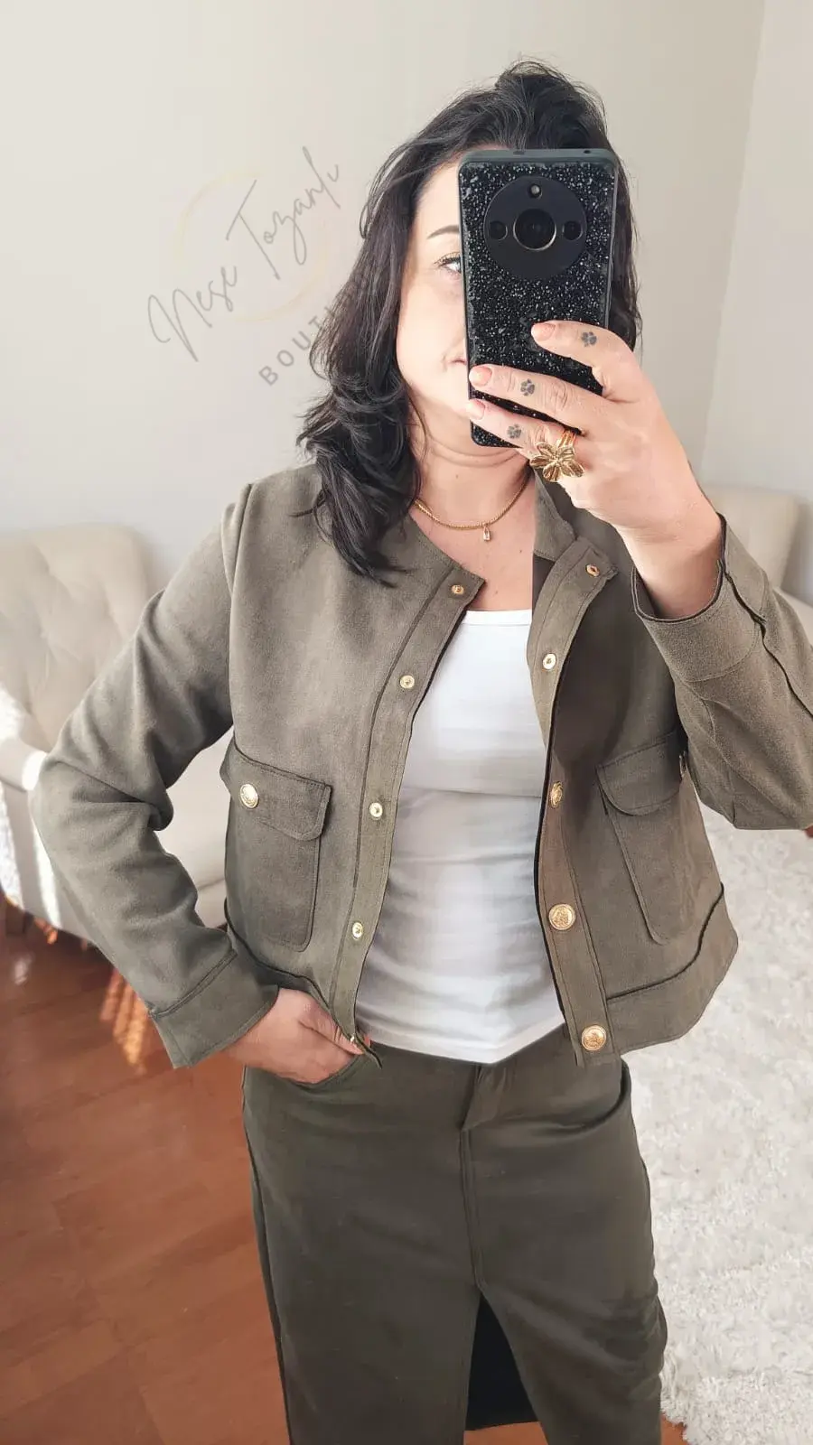 Neşe Tozanlı Boutique koleksiyonu, gardırobunuza zamansız ve stil sahibi bir imza katıyor. Haki yeşilin en asil tonu, lüks ve yumuşacık süet dokusuyla bu "eşsiz" tasarımda buluştu.
