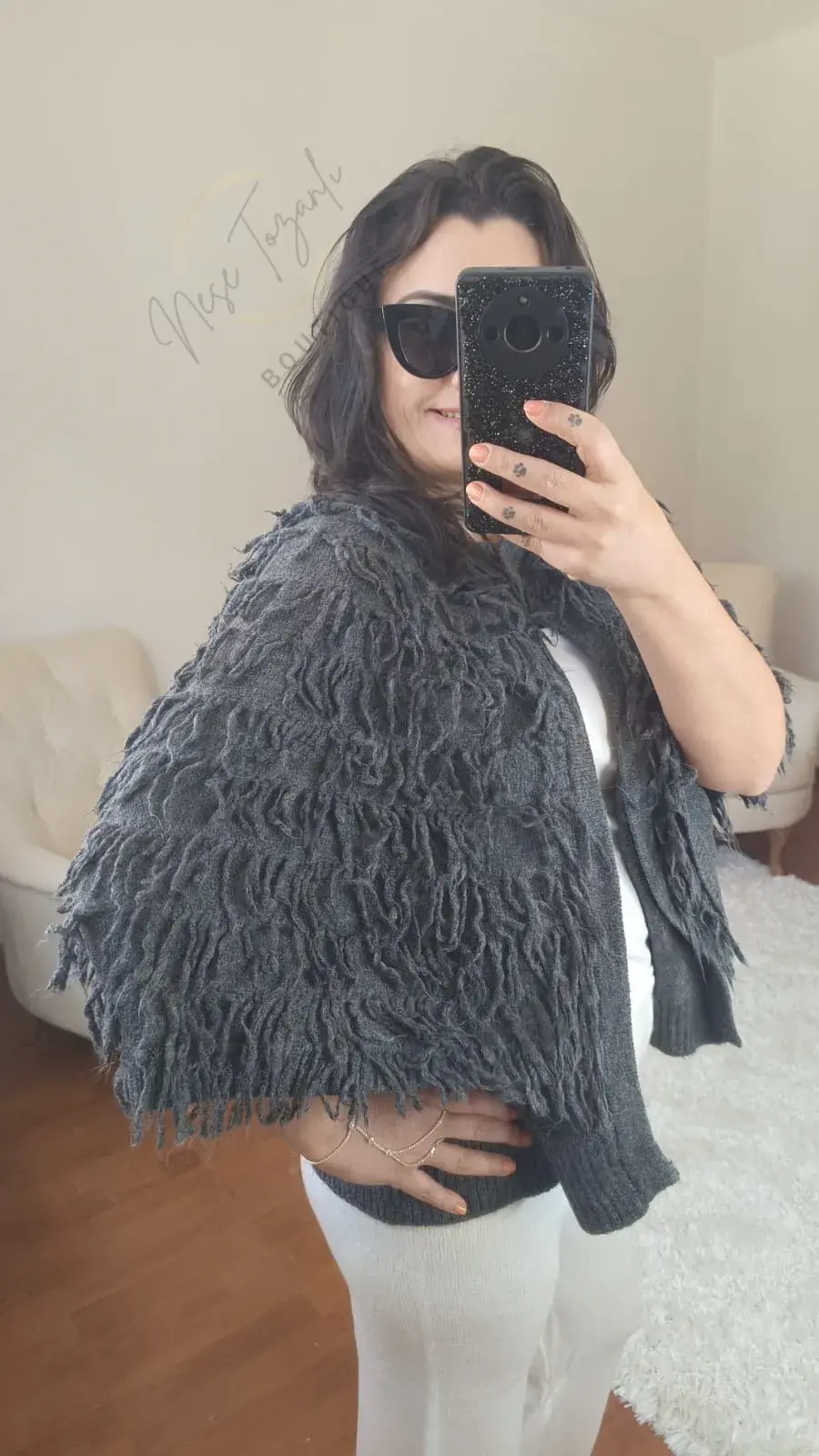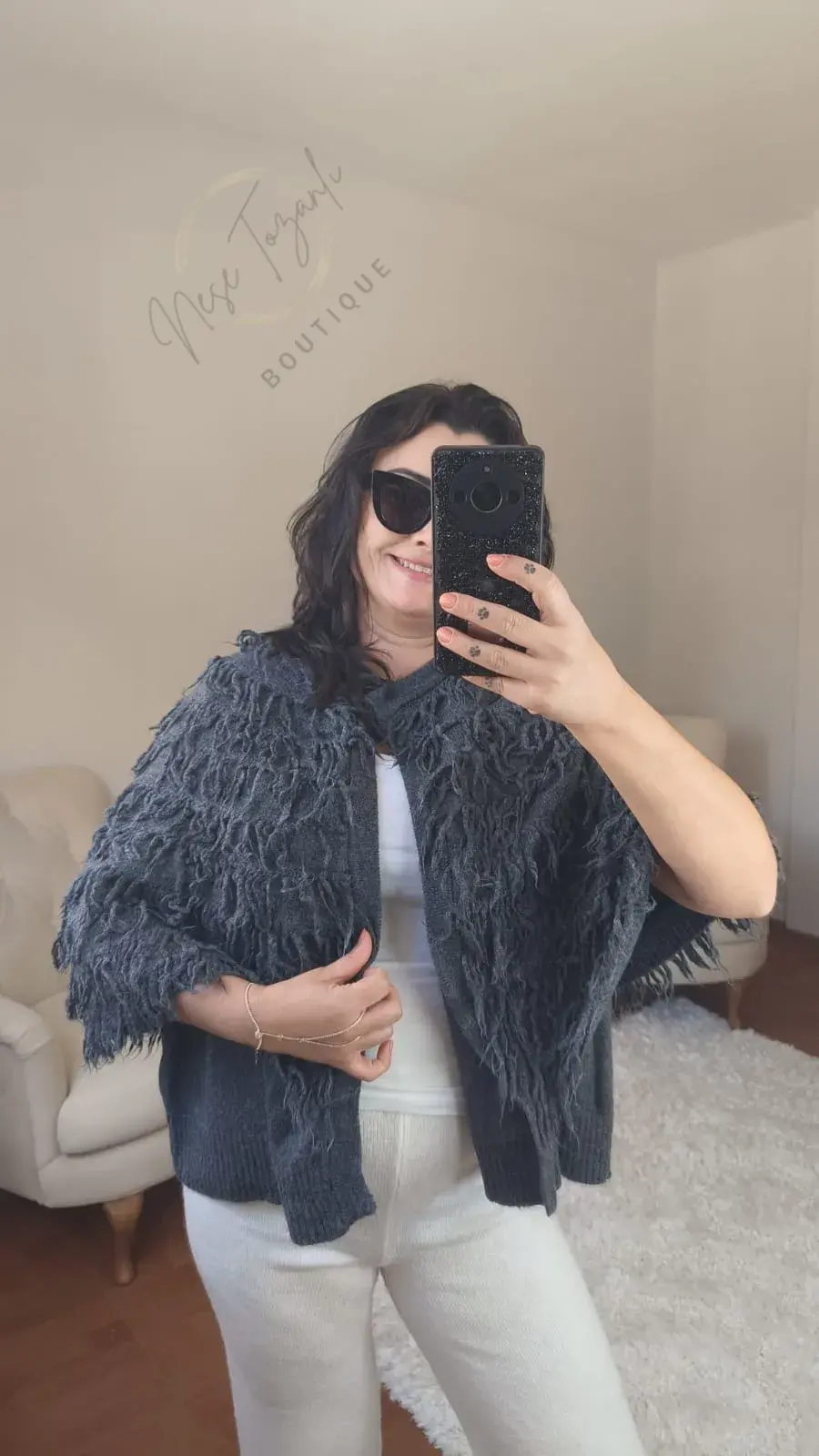 Neşe Tozanlı Boutique, sıradanlığa meydan okuyan tasarımlarla gardırobunuzu canlandırıyor. Bu İçi Yelekli Püskül Detaylı Gri Panço, sadece sizi ısıtmakla kalmaz, her hareketinizde dalgalanan saçaklarıyla stilinize hipnotik bir enerji katar.