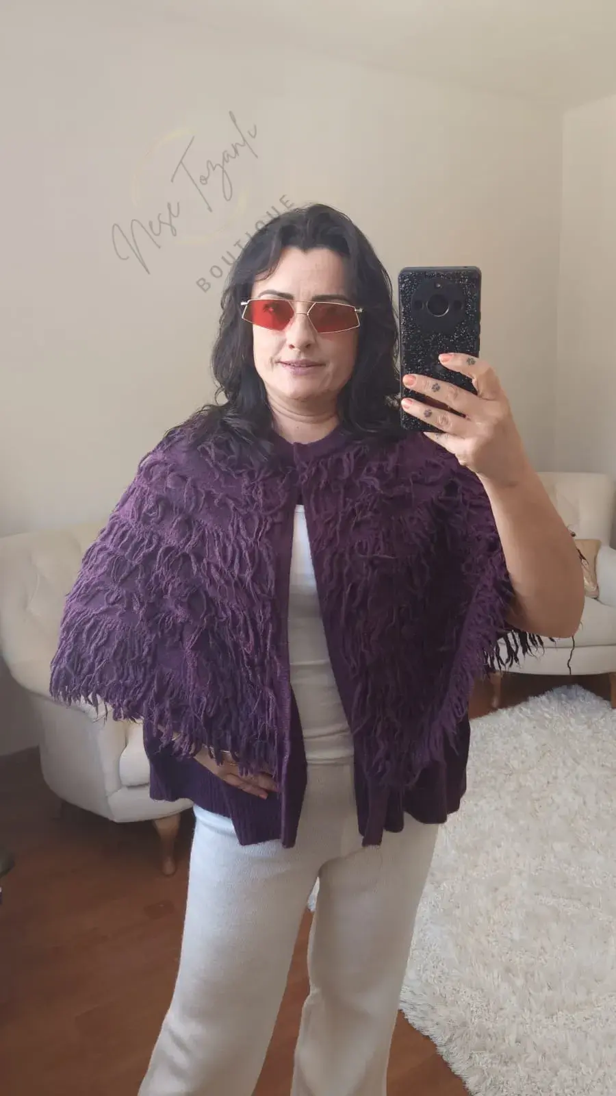 Neşe Tozanlı Boutique'in ikonik panço serisi, şimdi en iddialı rengiyle karşınızda. Bu Mürdüm Rengi Püsküllü Panço, kış stilinize hem renk hem de derinlik katmak için tasarlandı.