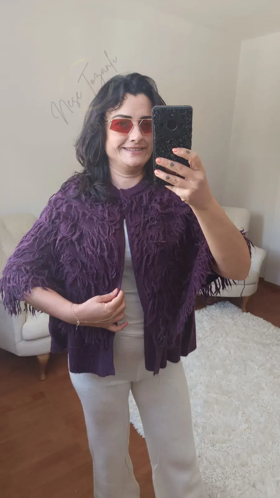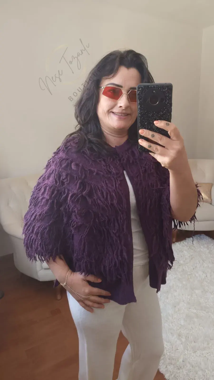 Mürdümün o zengin ve mistik tonu, yoğun saçak (püskül) detaylarıyla birleşerek her hareketinizde göz alıcı bir silüet yaratır. Tasarımın kalbindeki gizli yelek formu, pançonun omuzlarınızda sabit durmasını sağlar, kayma yapmaz ve size hareket özgürlüğü tanır. Hem sizi sıcacık sarar hem de stilinize "lüks" bir dokunuş ekler.