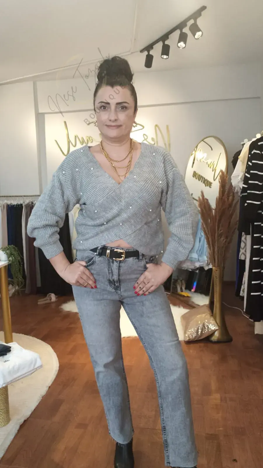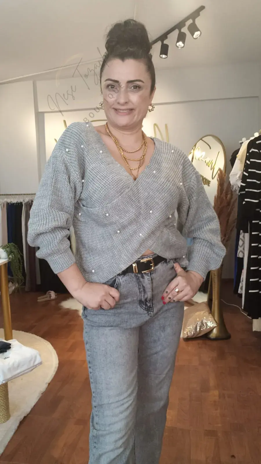 Neşe Tozanlı Boutique ile kış stilinize ışıltılı bir dokunuş yapın. Bu İnci Detaylı Gri Kazak, triko konforunu "haute couture" bir şıklıkla birleştiriyor.