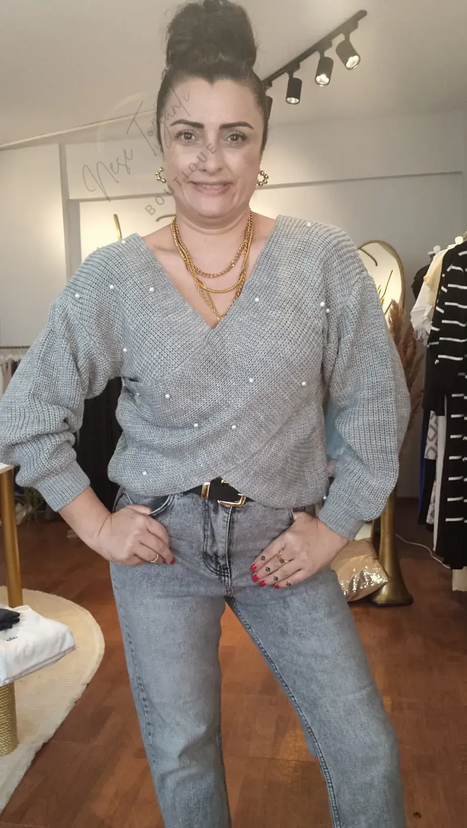 Yumuşak dokulu gri triko üzerine özenle işlenmiş beyaz inci detayları, kazağı sade bir giysi olmaktan çıkarıp üzerinizde taşıdığınız bir aksesuara dönüştürür. Kruvaze (wrap) gelen V yaka kesimi, boynunuzu daha uzun ve zarif gösterirken, bel hizasında biten formu yüksek bel pantolonlarınızla mükemmel uyum sağlar.