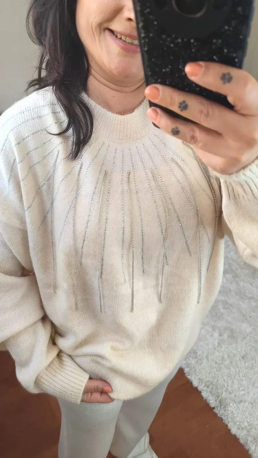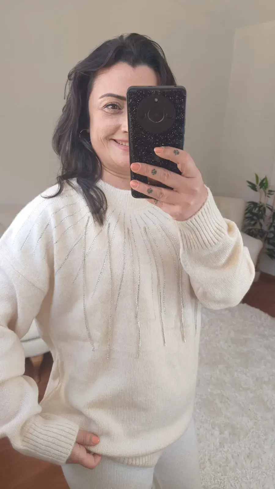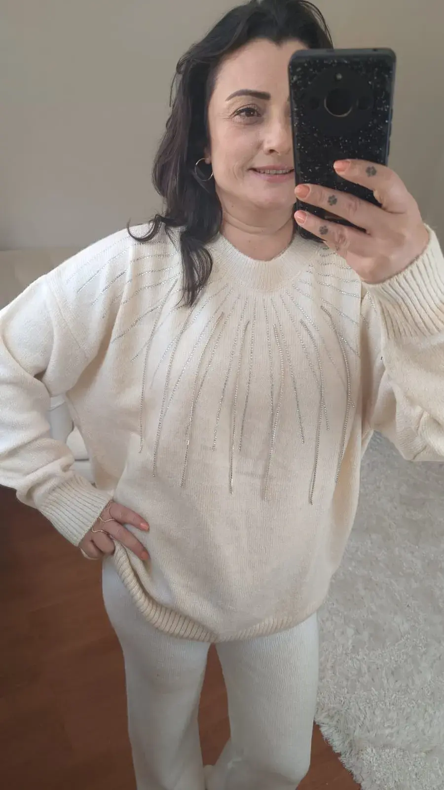 Neşe Tozanlı Boutique felsefesini tanımlayan o "eşsiz" parçalardan biri: Konfor, kalite ve zarafet bu tasarımda buluştu. Sizi sıcacık tutacak yumuşacık lüks triko dokusu, teninizde benzersiz bir his bırakırken; özenle işlenmiş ışıltılı taş detayları, stilinize göz alıcı bir dokunuş katıyor.