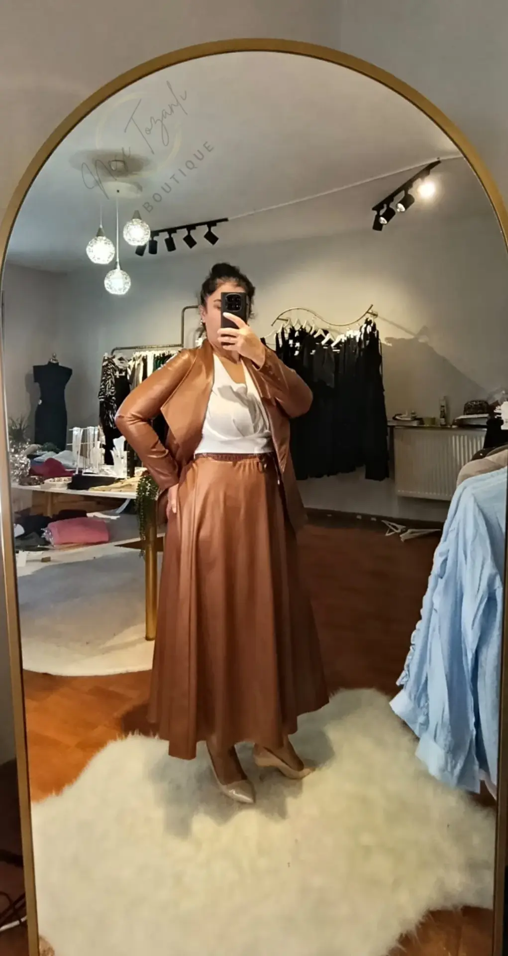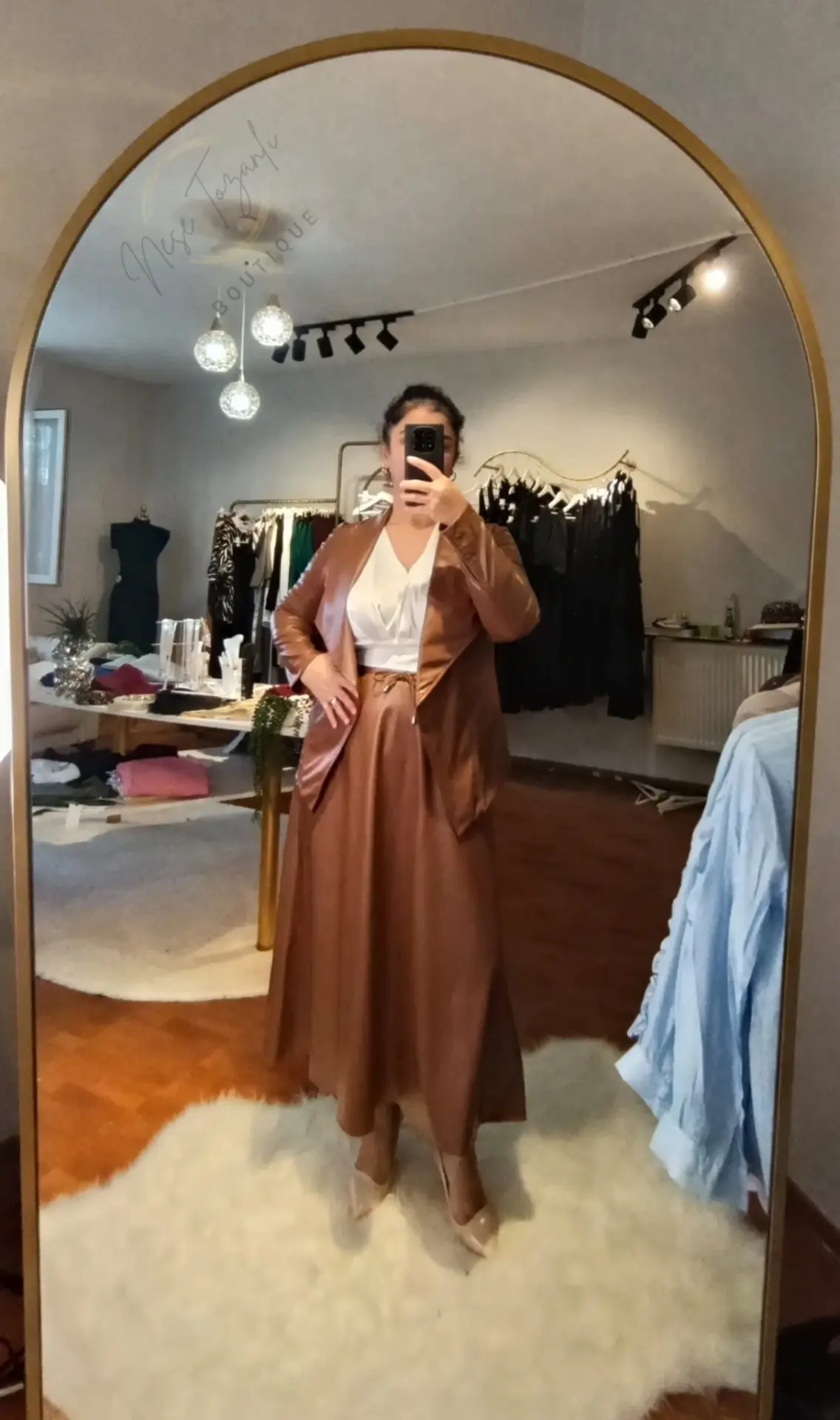 Neşe Tozanlı Boutique olarak, sizi tek seferde kusursuz şıklığa ulaştıracak parçaları seviyoruz. Bu Taba Rengi Deri İkili Takım, efor harcamadan "stil sahibi" görünmenin anahtarıdır.
