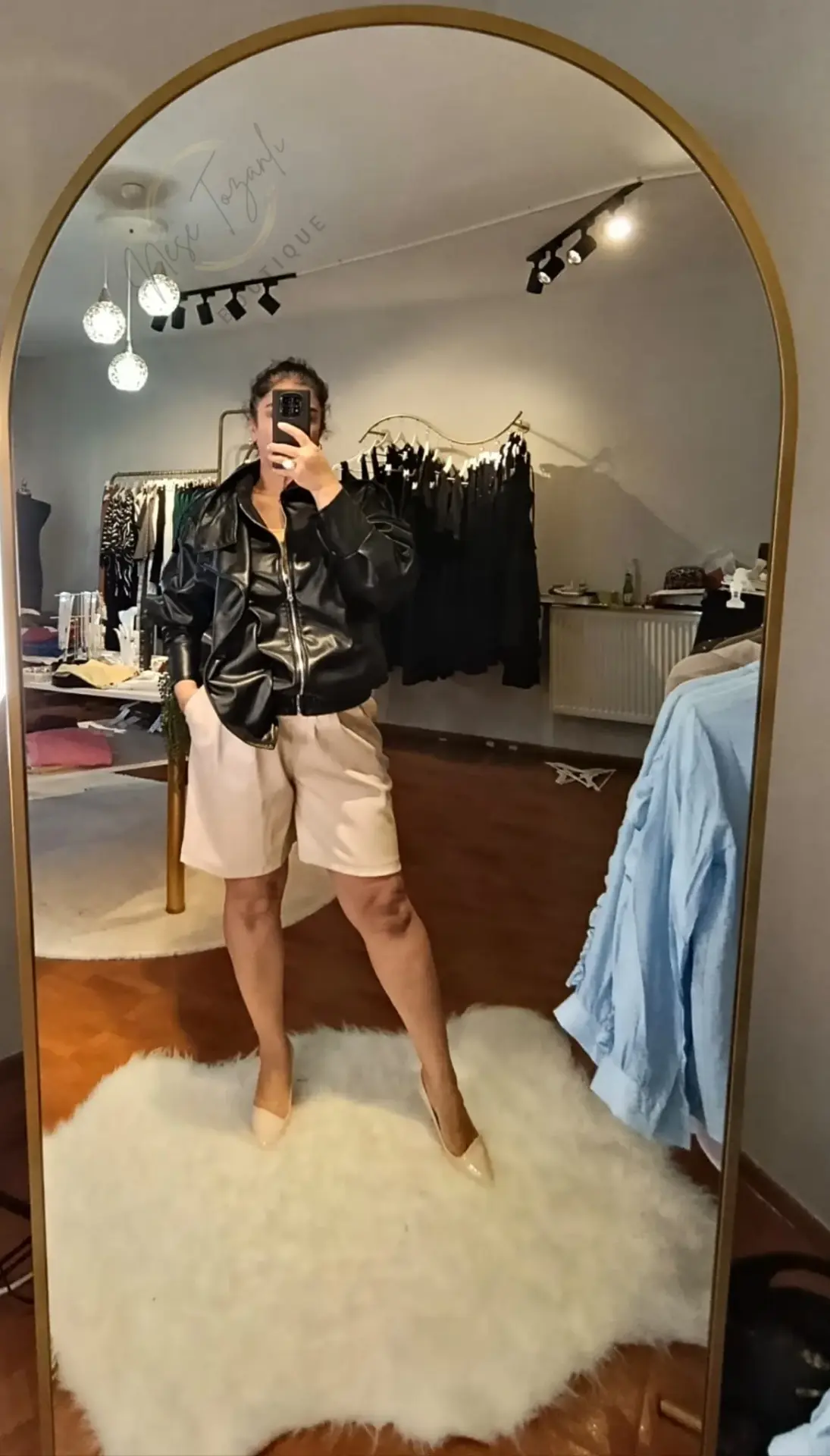 Neşe Tozanlı Boutique olarak, klişeleri yıkmayı seviyoruz. Şortun sadece yazlık ve spor bir parça olduğunu düşünüyorsanız, bu tasarım fikrinizi değiştirmeye geliyor. Krem Deri Bermuda Şort, şehirli kadının gardırobuna modern bir soluk getiriyor.